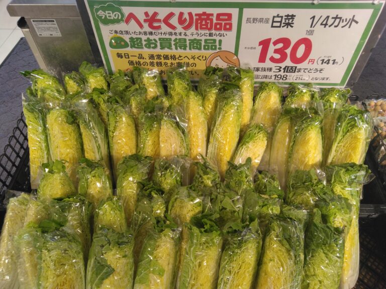 本日のおすすめは白菜です!1/4サイズにカット済みです!鍋がおすすめです!ぜひお買い求め下さいませ!