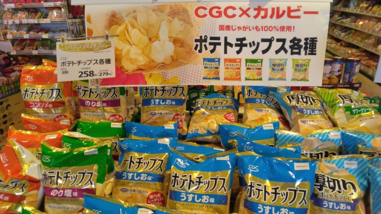 こんにちはみしまや学園店です。今月のおすすめはCGCのポテトチップス・厚切りポテトチップスです!国産じゃがいも100%使用でうすしお、コンソメ、のり塩、サワークリームオニオン味があります。是非この機会にお買い求めくださいませ。