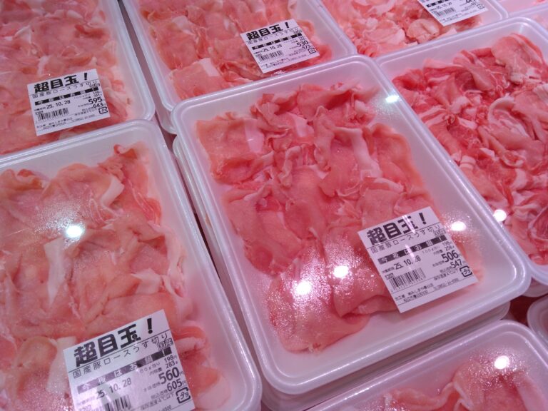 春日店です。本日のおすすめ品は国産豚ロースうすぎり肉です。最近寒くなってきましたね。そろそろお鍋が食べたくなりませんか?本日100g当たり198円にて販売しております。他にも生姜焼きや丼物にもおすすめですよ。