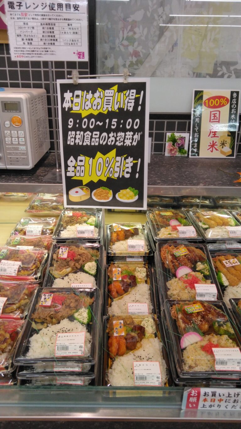 昭和食品のお惣菜が本日、10%引きです。 午後3時までお買い得が続きます。是非お買い求めくださいませ。