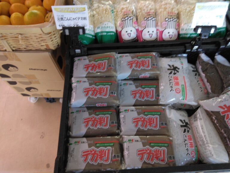 こんにちは八束店です。本日のおすすめはマルキンのデカ判こんにゃくです。おでん、煮物など用途はさまざまです。これからの季節はおでんが最高!