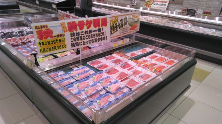 今年の秋は食材から、お魚に秋を見つけよう、秋鮭切り身、この時期のご馳走ならこれ、焼き魚におすすめ、脂ののった新物生サンマもあります。