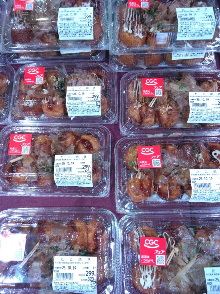 こんにちは、大田長久店です。本日のおすすめ商品は、たこ焼きです。本日たこ焼き8個入り 本体価格299円 税込価格323円で販売中です。