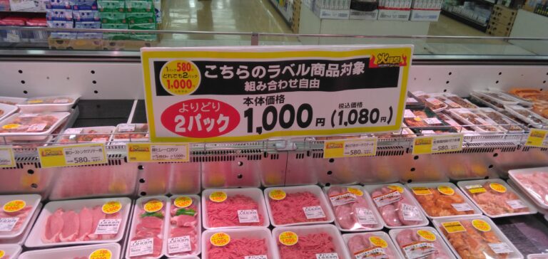 田和山店精肉コーナーではお買い得580円パックが2点合わせると更に1000円と160円の値引き相当になるより取りセールを開催中です。 ぜひともお買い求めくださいませ