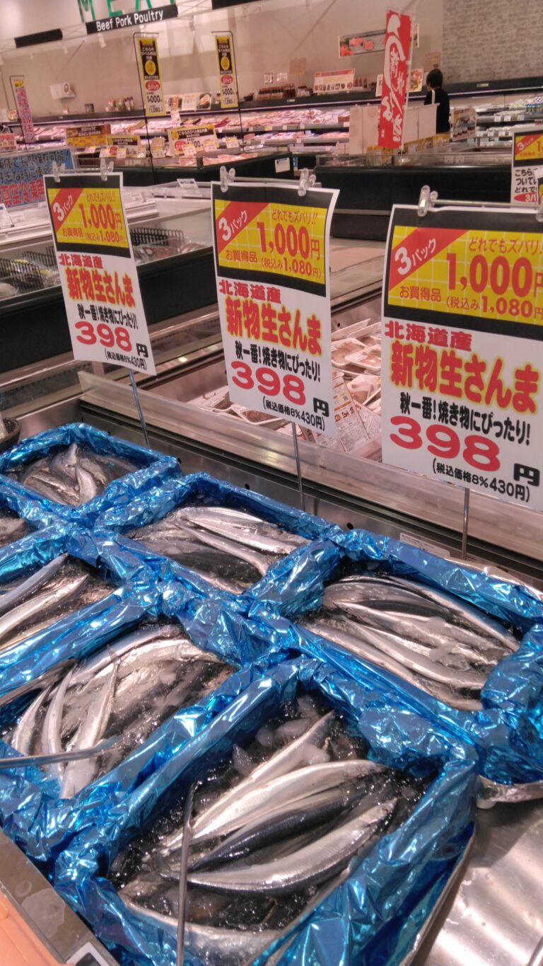 こんにちは!みしまや東川津店鮮魚コーナーです!本日は火曜祭!お魚コーナーでは毎週恒例の3品お買い得セールを実施中!特にいまがおすすめなさんまは必見!ぜひお買い求めくださいませ!