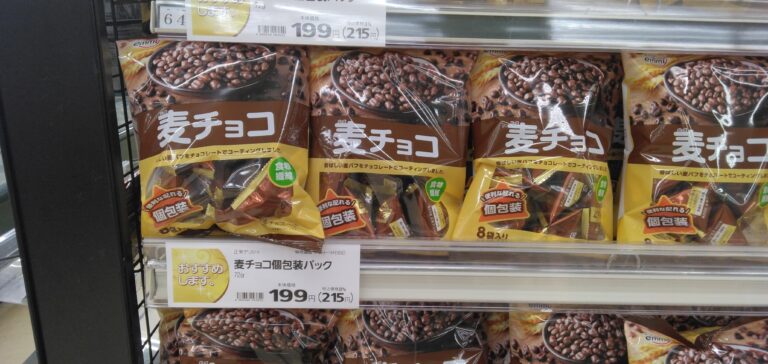 こんにちは!みしまや田和山店のお菓子コーナーおすすめ商品は、正栄デリシィの麦チョコです!サクサクっとした軽めのパフに程よい甘さのチョコレートをコーティング!ぜひ今日のおやつにいかがでしょうか♪