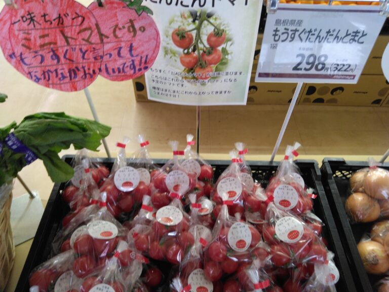 こんにちは八束店です。本日のおすすめはもうすぐだんだんトマトです。フルーツみたいに甘ーく食べごたえ抜群です。ぜひ一度召し上がってみてください!