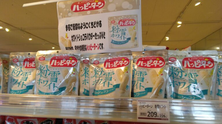 おはようございます。今日も寒いですね。 只今亀田製菓ハッピーターン粉雪ホワイト冬だけの限定となっておりますので是非お買い求め下さいませ。