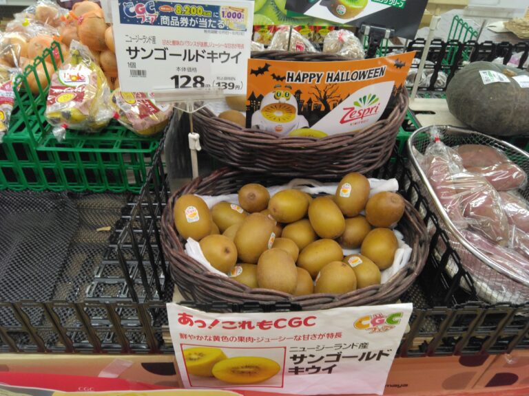 本日のおすすめは、ニュージーランド産のサンゴールドキウイフルーツをおすすめします。黄色の果肉で甘いです。ぜひお買い求めくださいませ。