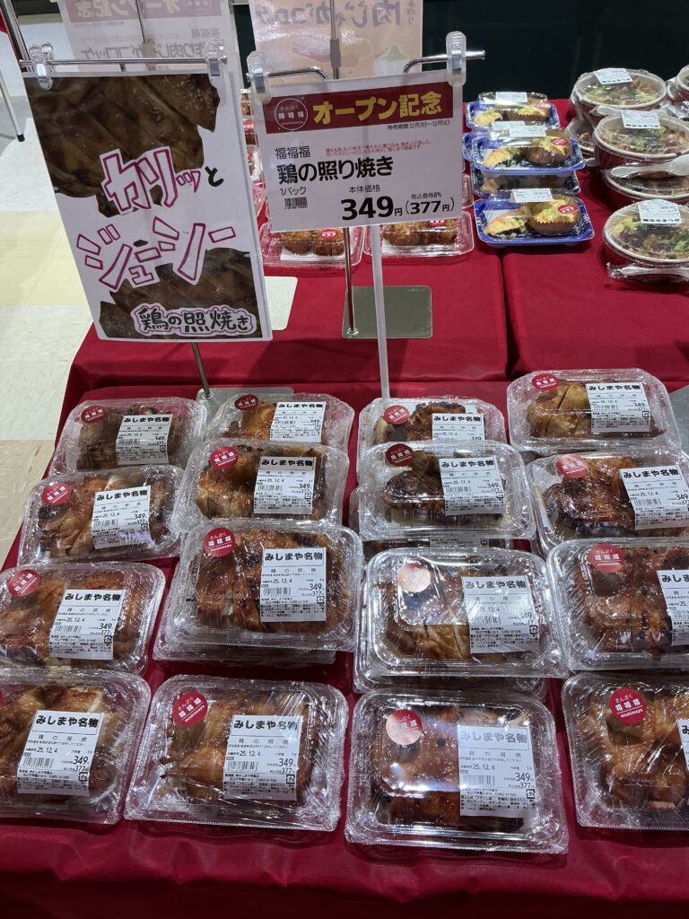 昨日オープンで大好評のみしまやオリジナル惣菜店、福福福(さんぷく)の大人気商品、鶏の照り焼きがお勧めです! 昨日は早々に完売してしまいましたので今日は増産しております。是非お早めにお買い求めください。