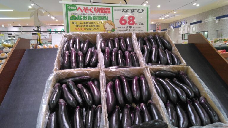 東川津店本日のへそくり商品はなすびです。炒め物や天ぷらなどに!