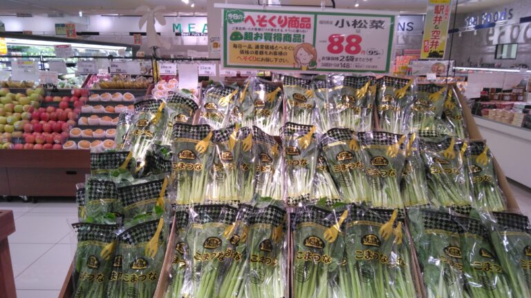 東川津店、本日のへそくりは小松菜です! 野菜炒めがおすすめ♪ この機会に是非お買い求めくださいませ!
