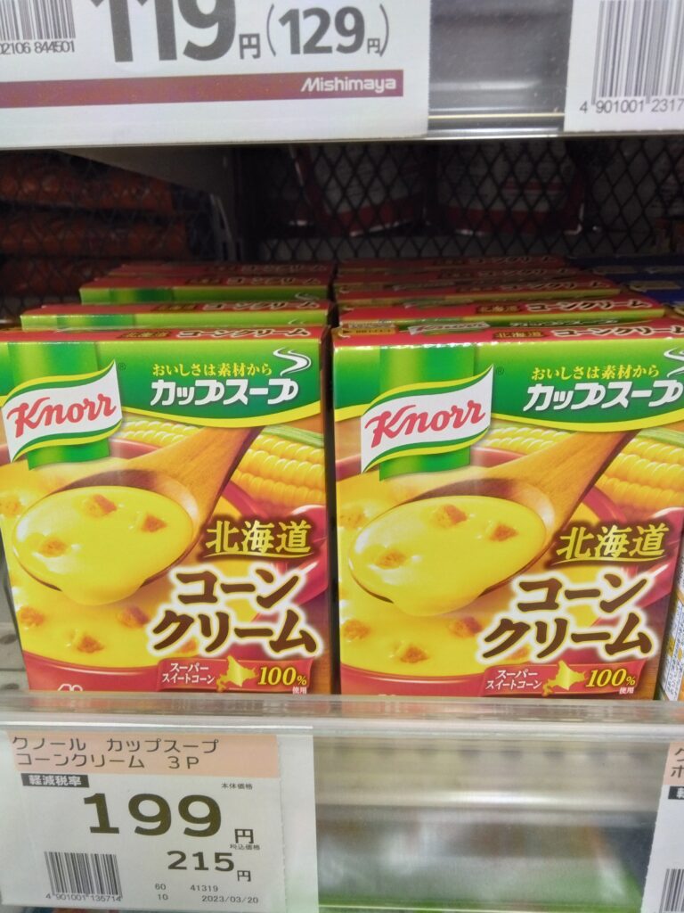こんにちは、みしまや鹿島店です。 今朝も寒かったですね(>_<) そこで本日のおすすめは、クノールのカップスープ『コーンクリーム』です。朝、スープを飲むと体が温まって『今日も頑張るぞー』と気合いが入ります! コーンクリームの他にも種類は様々あります。 ぜひお試し下さい。
