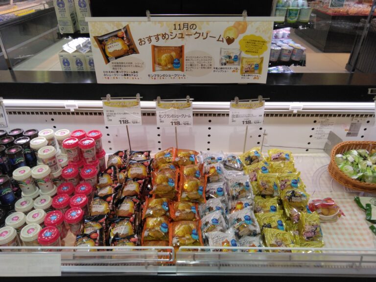 みしまや春日店日配コーナーからのおすすめ品はシュークリームです!!モンブラン味や昨年大好評だった生チョコ味など様々な味を販売しております。食後のデザートとして是非お買い求めくださいませ!