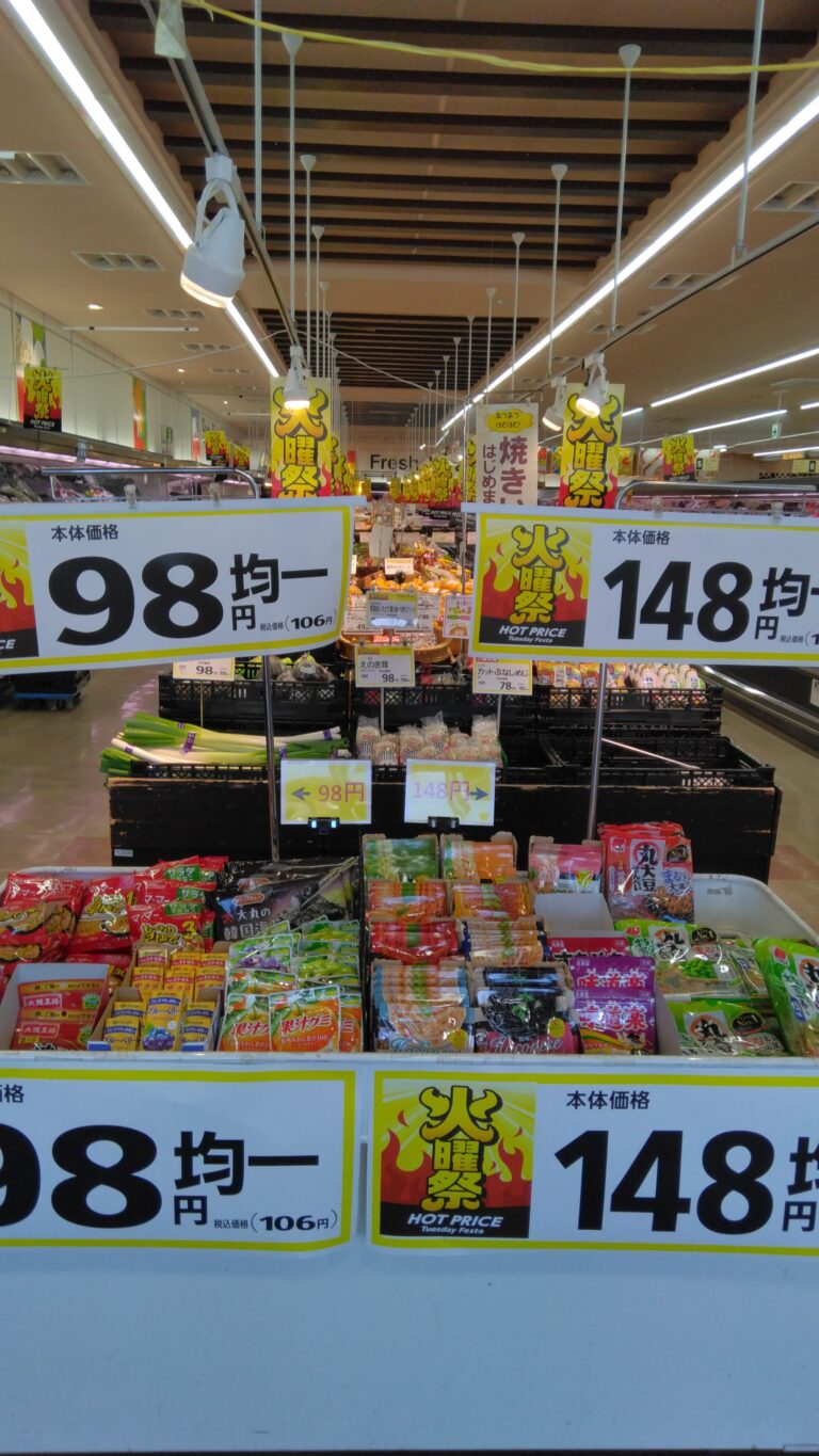 本日より火曜祭がリニューアルしました。98円均一・148円均一などご用意いたしました。どうぞお立ち寄りお買い求めくださいませ。