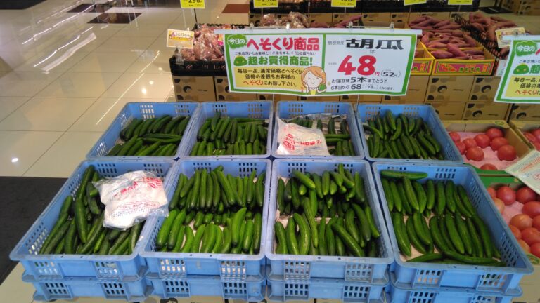 大田長久店です。 本日は胡瓜バラ売りがお買い得になっています。 -5本お買い上げ頂くと1本当たりがさらにお安くなりますので是非お買い求めくださいませ。