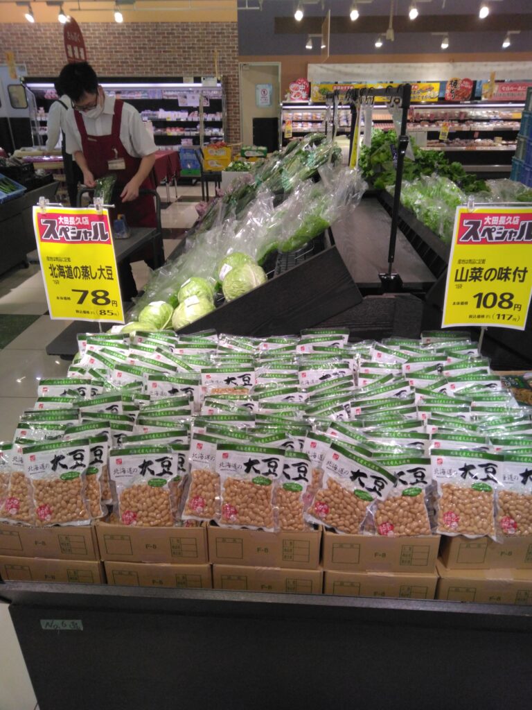 本日は大豆の水煮がお買い得です。ひじきとの煮物や鶏肉とトマトを使った洋風煮込み、ハンバーグ、味噌汁、カレーなどにおすすめです。
