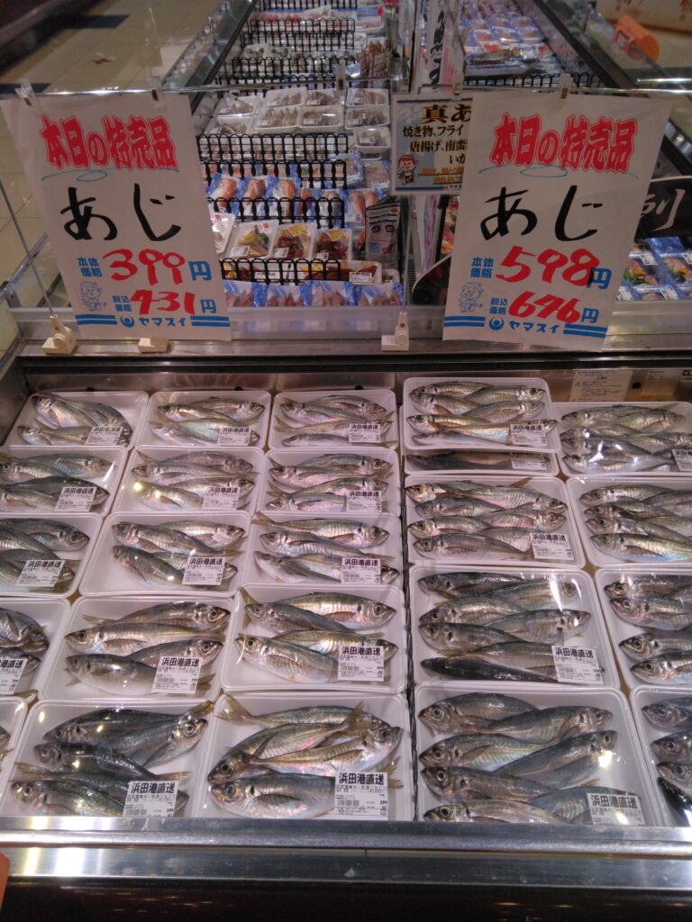 浜田港からアジが入荷いたしました。お刺身、塩焼き、アジフライなどにどうぞ。