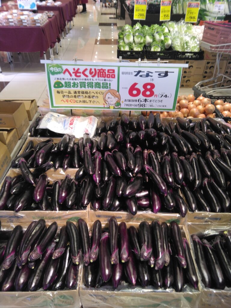 本日は茄子がお買い得です。麻婆なすなどの中華料理や定番の炒め物、豚肉や鶏肉を使ったメインのおかずなどにご活用下さい。