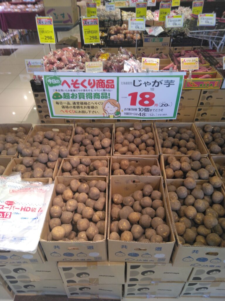 本日はじゃが芋がお買い得です。カレーやシチューに、肉じゃがやポテトサラダ、グラタン、コロッケなど、いろいろなメニューにご活用下さい。