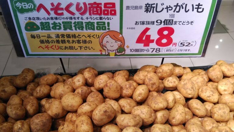 本日はメークインがお買い得です。煮崩れしにくい品種ですのでカレーなどの煮込み料理やおでんなどに適しています。