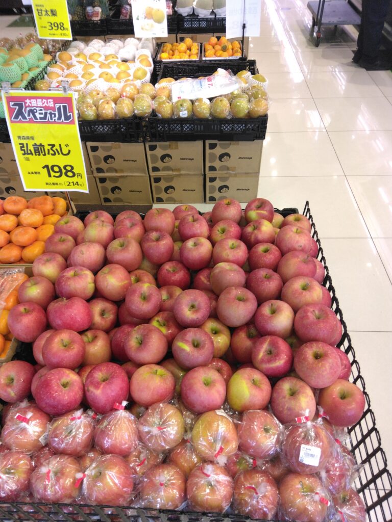 本日は弘前ふじがお買い得です。糖度が高くて酸味は少なく果肉はふじよりもやややわからめです。シャキシャキ感を味わうなら生食で。ジャムやスムージー、焼きリンゴなどにも。