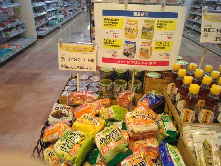 こんにちは、楽山店です。本日おすすめするのはCGCのフリーズドライスープ! 6種類あり、フリーズドライ製法なので具沢山なんです♪ カロリーもオフですし、好きなトッピングを足したり、ごま油で味変するのもおすすめですよ、是非お試し下さいませ。