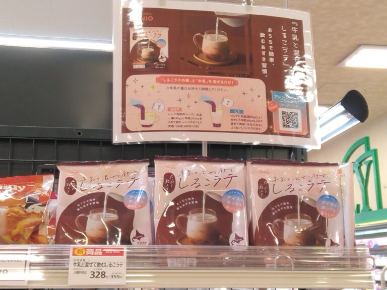 こんにちは、楽山店です。本日入荷の新商品をご紹介! 牛乳と混ぜるだけで簡単に作れる「しるこラテ」はあんこの粒々もしっかり残ってて、食べれて飲めれる新感覚のドリンク! アイスでもホットでも両方できますので、是非お試し下さいませ。