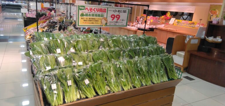 こんにちは、田和山店農産部門です。本日のおすすめは小松菜です!地物の小松菜となっております!お味噌汁やごま和えなどにいかがでしょうか。ぜひお買い求めくださいませ。
