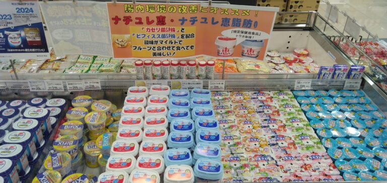 みしまや田和山店日配コーナーです!本日のおすすめはナチュレ恵各種でございます!トクホ取得のおすすめ商品です!ぜひお買い求めくださいませ!