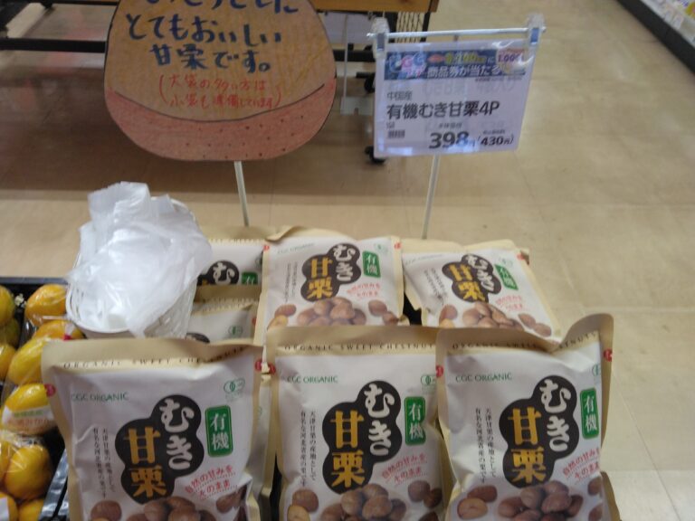こんにちは八束店です。本日のおすすめはCGCむき栗です。しっとりとしてあまーいむき栗です。小袋に入って食べやすいサイズです。お茶のおともにどうぞ!