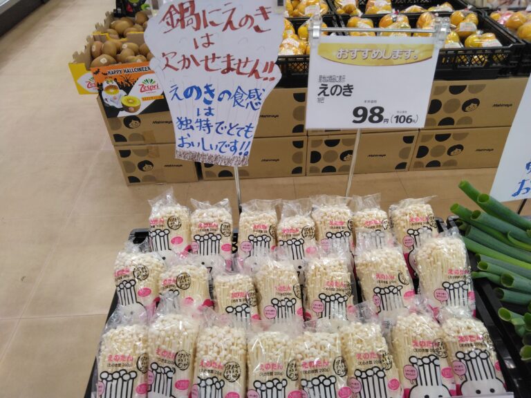 こんにちは八束店です。本日のおすすめはえのきです。これからの季節は鍋料理が最高です。鍋料理で体の芯まで温めて下さい!